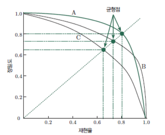 그러나 A와 B 처럼 P-R 곡선의 교차가 발생한다면, 재현율 및 정밀도를 종합적으로 고려해 성능을 측정할 수 있다. 이때 사용되는 것이 손익 분기점 (Break-Even Point, BEP)이다. BEP는 '정밀도 = 재현율' 일때를 나타내는 값으로 BEP 기준으로 0.8인 A가 가장 좋은 성능을 보이는 것을 알 수 있다. 하지만 BEP는 활용한 방법은 지나치게 간소화한 면이 있어서 F1 Score를 더 많이 사용하게 된다.