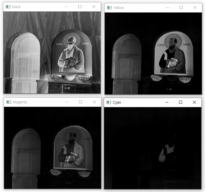 black = cv2.min(CMY[0], cv2.min(CMY[1], CMY[2])) # 원소 간의 최솟값 저장
