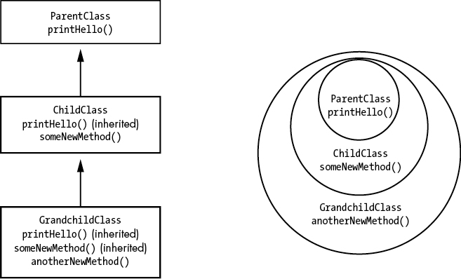 ChildClass는 ParentClass의 하위 클래스 (subclass)로, ParentClass와 동일한 메소드를 모두 가지게 된다. 이것을 일컬어 ChildClass가 ParentClass로부터 메소드를 상속받았다고 말한다. GrandChildClass 역시 ChildClass의 하위클래스이므로, 따라서 ChildClass와 그 부모인 ParentClass의 모든 메소드를 똑같이 가지게 된다.