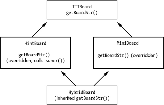 아래의 그림과 같이 TTTBoard, HintBoard, MiniBoard는 정의된 getBoardStr() 메소드를 , HybridBoard는 상속된 getBoardStr() 메소드를 가지고 있다.