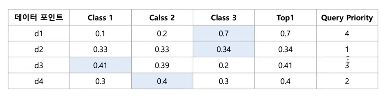 모델이 예측한 (각 클래스에 속할 확률) 중 Top1 확률이 가장 낮은 데이터부터 Query