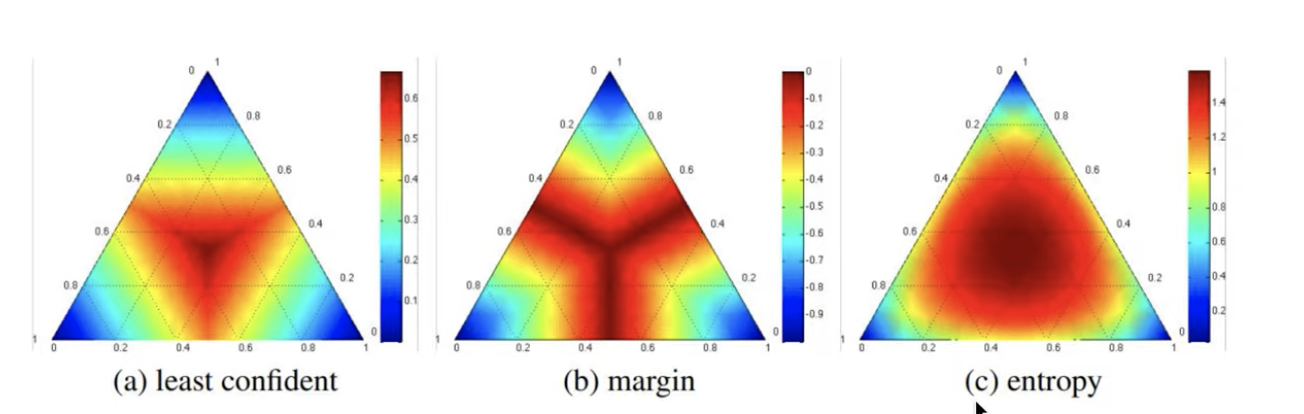 - uncertainty-based sampling: least confident (Lewis and Catlett), max margin and max entropy