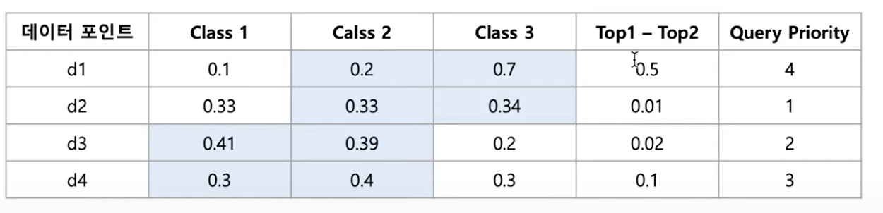모델이 예측한 (각 클래스에 속할 확률) 중 Top1, Top2 확률의 차이가 가장 적은 데이터 부터 Query