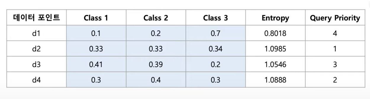 모델이 예측한 (각 클래스에 속할 확률) 중 엔트로피(무질서)가 가장 큰 데이터로 부터 Query