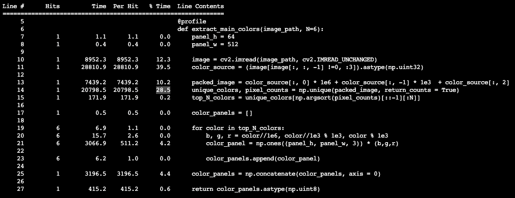 위 코드에서 extract_main_colors 함수의 각 라인에서 소요되는 시간과 메모리 사용량 등의 성능 정보를 확인하려면 다음과 같이 kernprof 명령어를 사용합니다.