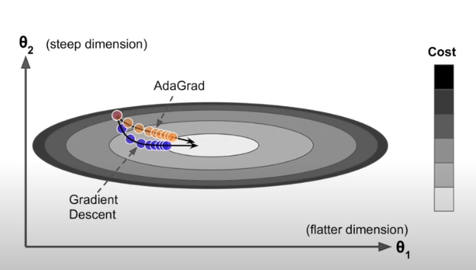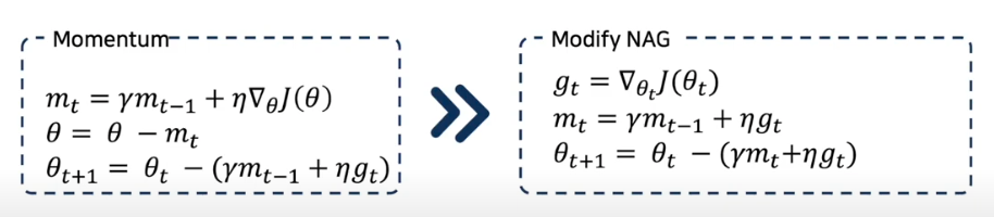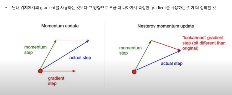 - Global minimum에 도착했으면 멈춰야 하지만 모멘텀 때문에 정확하게 수렴하지 못하게 되는 Momentum 문제점을 해결하기 위해서 만들어진 알고리즘