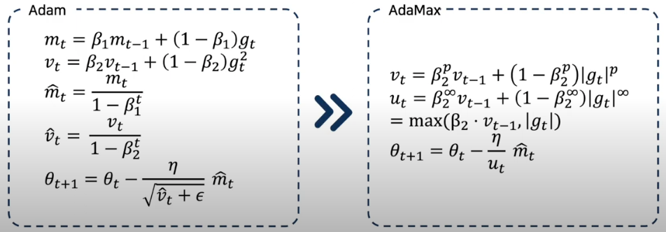 AdaMax는 L2 norm을 기반으로 learning rate를 조절하는 부분을 Lp norm으로 확장시킨 알고리즘
