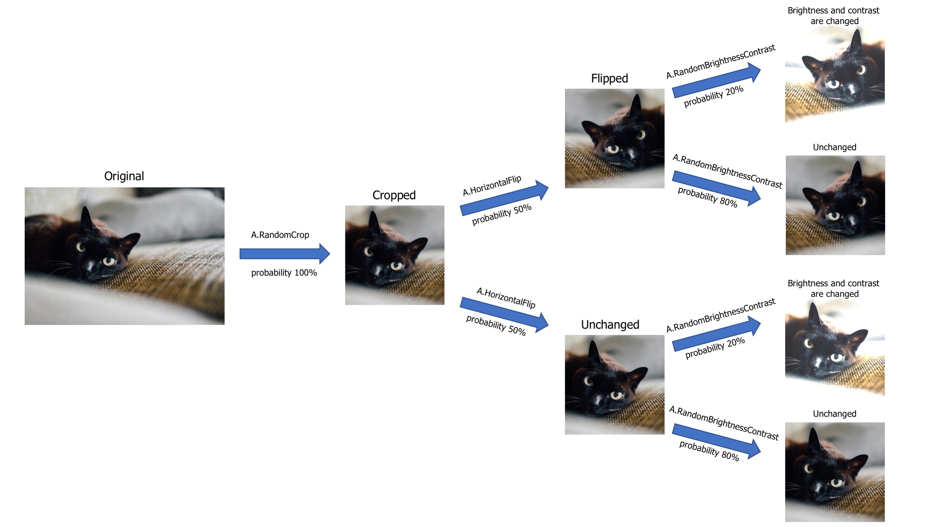 다음과 같이 Augmentation을 하게 된다면 Original에 해당되는 이미지를 A.RandomCrop을 height 및 Width의 조건에 따라서, 랜덤하게 Crop을 하게 된다. 다음으로는 50%의 확률을 통해서 A.HorizontalFlip을 진행하게 되고, Flip된 이미지를 다시 20:80의 확률로 Brightness 그리고 Contrast를 진행하게 된다.