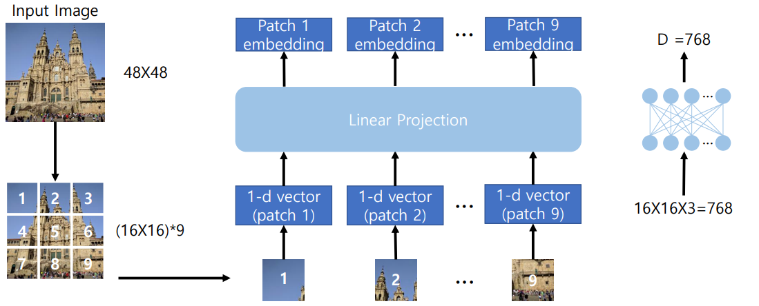 - ViT는 이미지를 패치로 분할한 후, 이를 NLP의 단어로 취급하여 각 패치의 Linaer Embedding을 순서대로 Transforemr의 input으로 넣어 이미지를 분류함