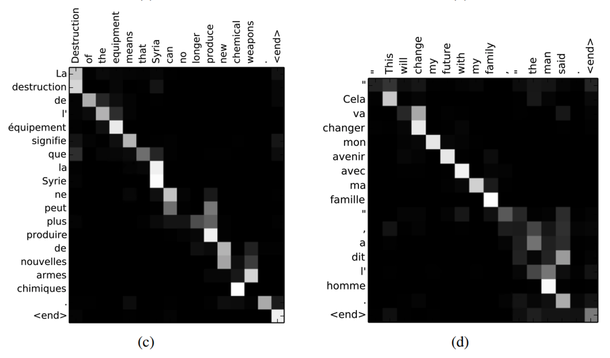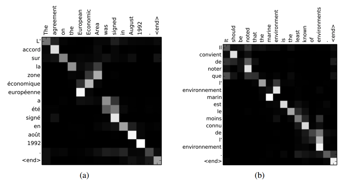 annotation weight값 a_ij를 visualizing한 모습을 보면, source sentence의 word가 target sentence의 어떤 word와 연관성이 있는지 알 수 있다.