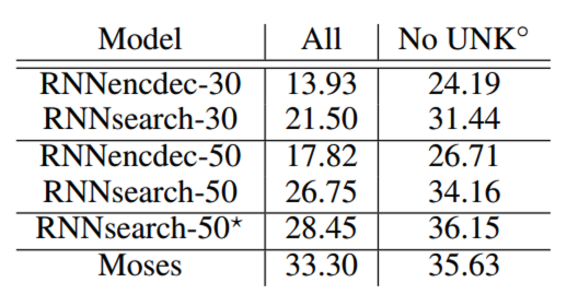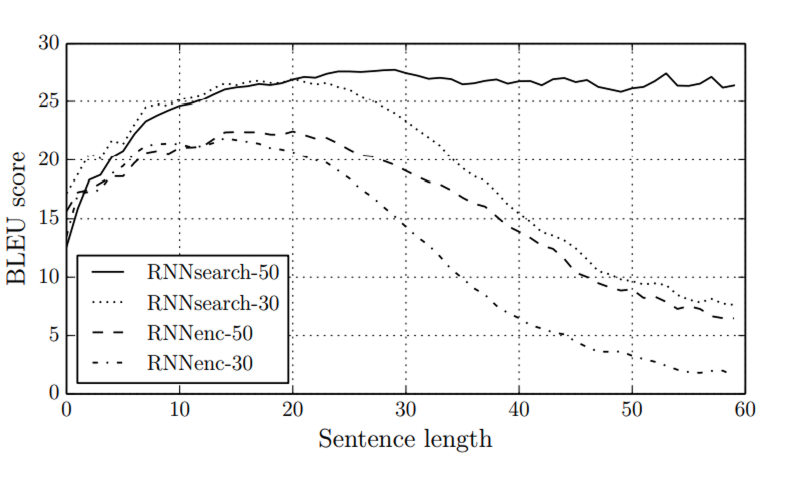 RNNsearch가 RNNencdec의 성능을 능가하였으며, 특히 RNNsearch-50은 긴 문장에서도 성능 하락이 없다는 것을 보여주었다.