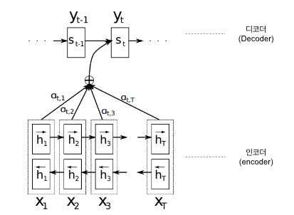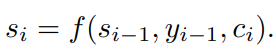 여기서 \(S_i\)는 i번째의 RNN hidden state이며, 일반적인 encoder-decoder 구조와 달리 context vector \(c_i\)는 target word \(y_i\)에 고유한 값이다.