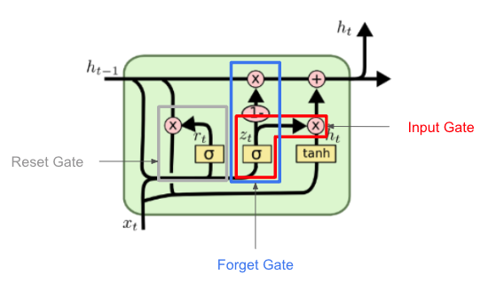 GRU 또한 LSTM과 마찬가지로 시그모이드 \(\sigma\)로 구성된 리셋 게이트 (reset gate) \( r_t\)와 업데이트 게이트 (update gate) \(z_t\)가 있다. 마찬가지로 시그모이드 함수로 인해 게이트의 출력값은 0과 1 사이로 나오므로, 데이터의 흐름을 게이트를 열고 닫아 제어할 수 있다. 기존 LSTM 대비 게이트 숫자가 줄어들게 되고, 따라서 게이트에 딸려있던 파라미터도 그만큼 줄어들어 계산을 줄인다