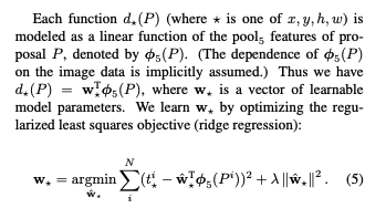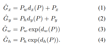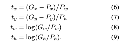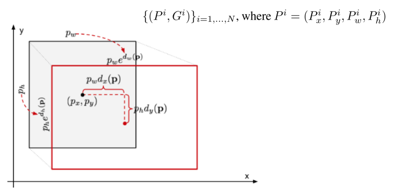 이때 위에 보이는 그림과 같이 P는 input proposal이며 x와y는 center에서의 값, w와 h는 width, height값을 나타내며, G는 예측한 Ground-Truth BBox 값을 나타내어, 각각의 값을