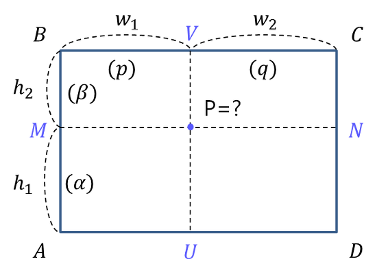 그림과 같이 점 P에서 x축 방향으로 사각형의 변까지의 거리를 w1, w2, y축 방향으로 거리를 h1, h2라 하고, 알려진 네 점에서의 데이터 값을 A, B, C, D라 할 때, P에서의 데이터 값은 bilinear interpolation에 의해 다음과 같이 계산된다 (단, α=h1/(h1+h2), β=h2/(h1+h2), p=w1/(w1+w2), q=w2/(w1+w2)).