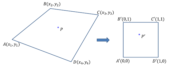 이 경우에는 아래 그림처럼 원래의 사각형을 어떤 직사각형으로 워핑(warping)시킨 후 워핑된 사각형에서 보간(interpolation)을 수행하면 된다.