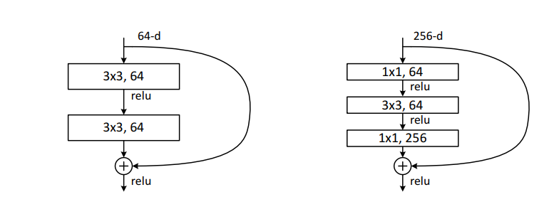 앞의 네트워크 구조를 다시 보면 잔차 블록의 형태가 두가지 인 것을 확인할 수 있다