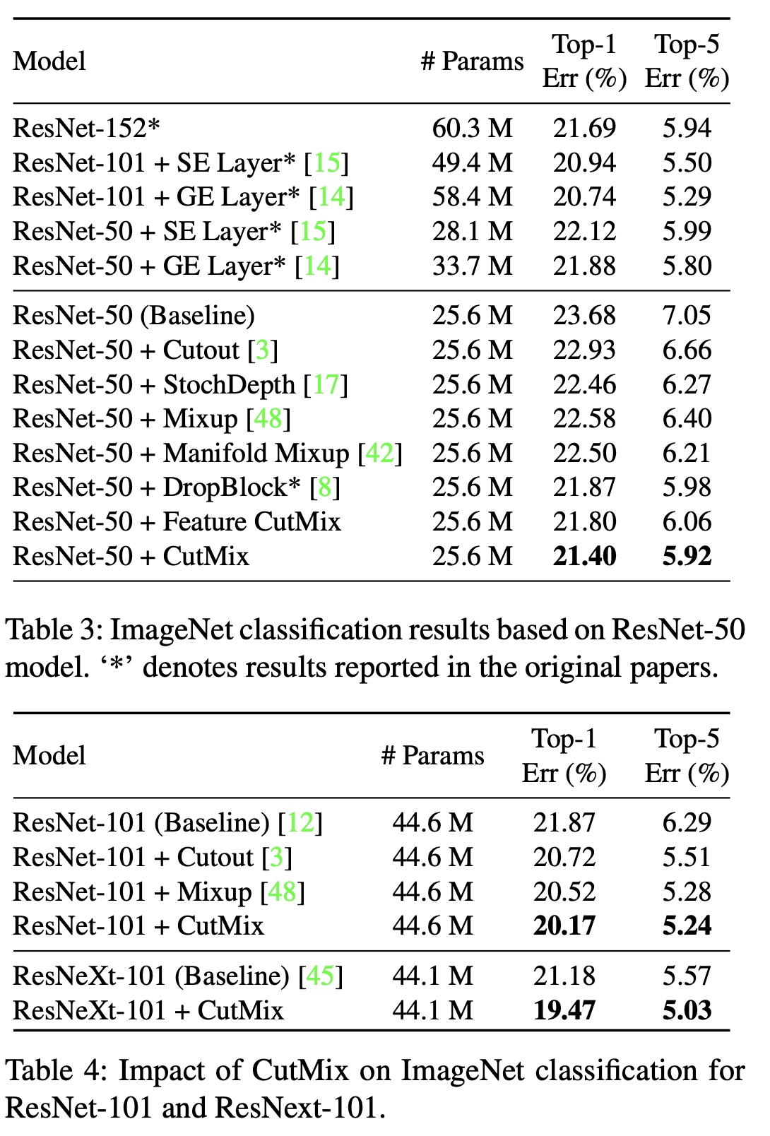 위의 테이블을 통해 결과를 도출하면 CutMix를 사용한 것이 top-1 에러가 제일 낮다. 또한 모델을 성능에 따라서도 CutMix 방법이 제일 낮은 top-1 에러를 보인다.