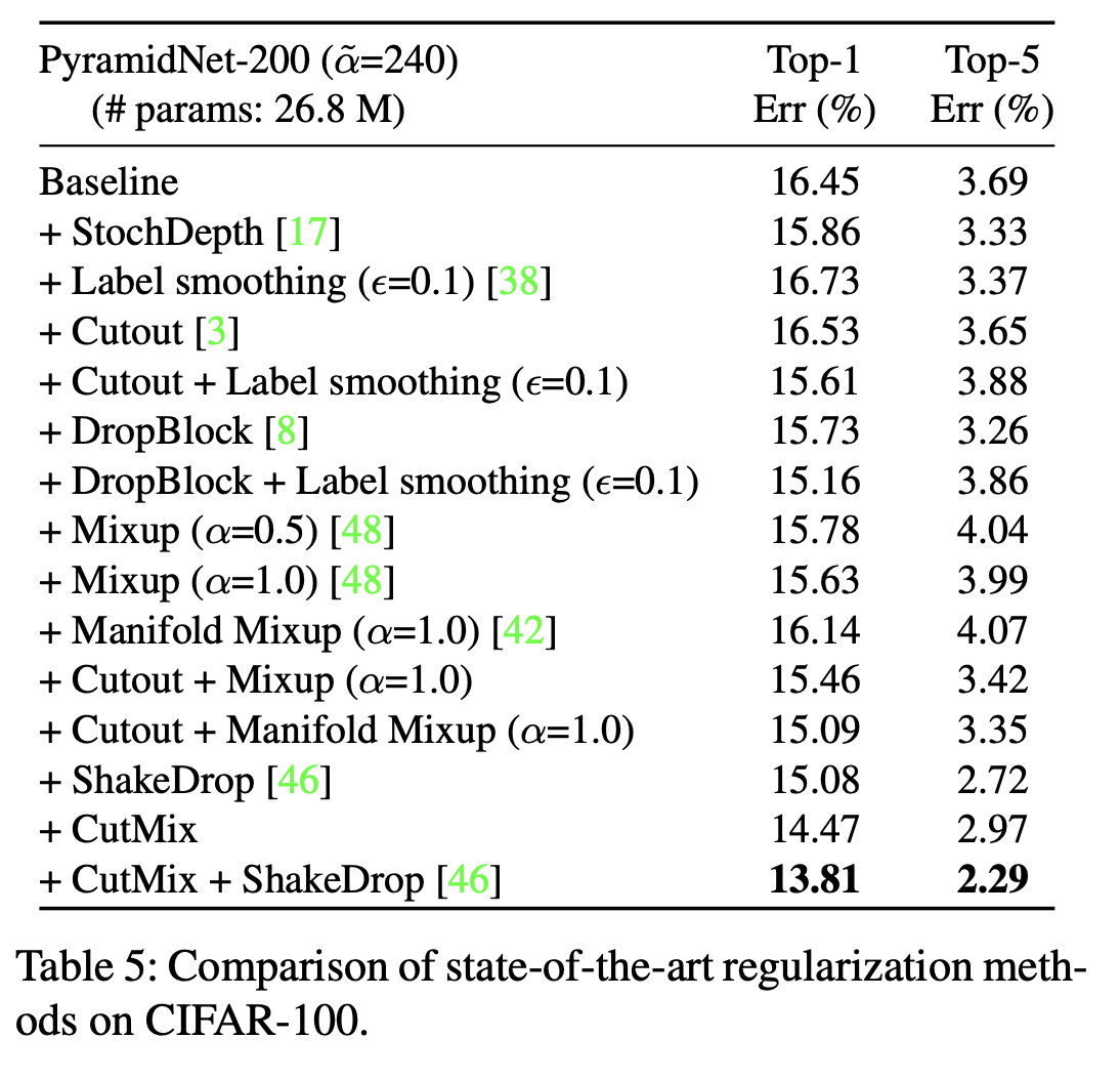 CIFAR-100 데이터셋은 통해 최신 정규화에 대한 비교하는 것이 아래의 테이블이다. Baseline을 기준으로 Label Smoothing 과 Cutout 을 제외하고는 모든 정규화에서 좋은 성능을 보였으며, CutMix + ShakeDrop(중간 feature에 노이즈를 삽입하는 방법) 이 가장 좋은 성능을 보여주는 것을 확인했다.