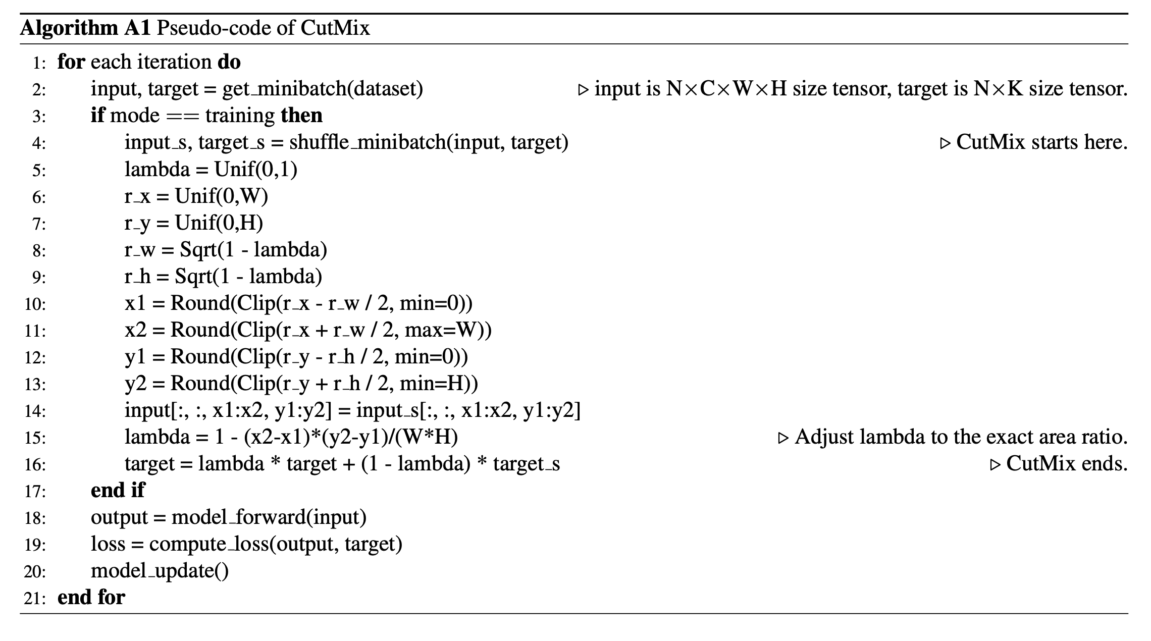 각 훈련 반복에서 위의 식에 다라 미니 배치에서 무작위로 선택한 두 개의 훈련 샘플을 결합하여 CutMix된 샘플 (\(\tilde{x}\), \(\tilde{y}\))을 생성한다.