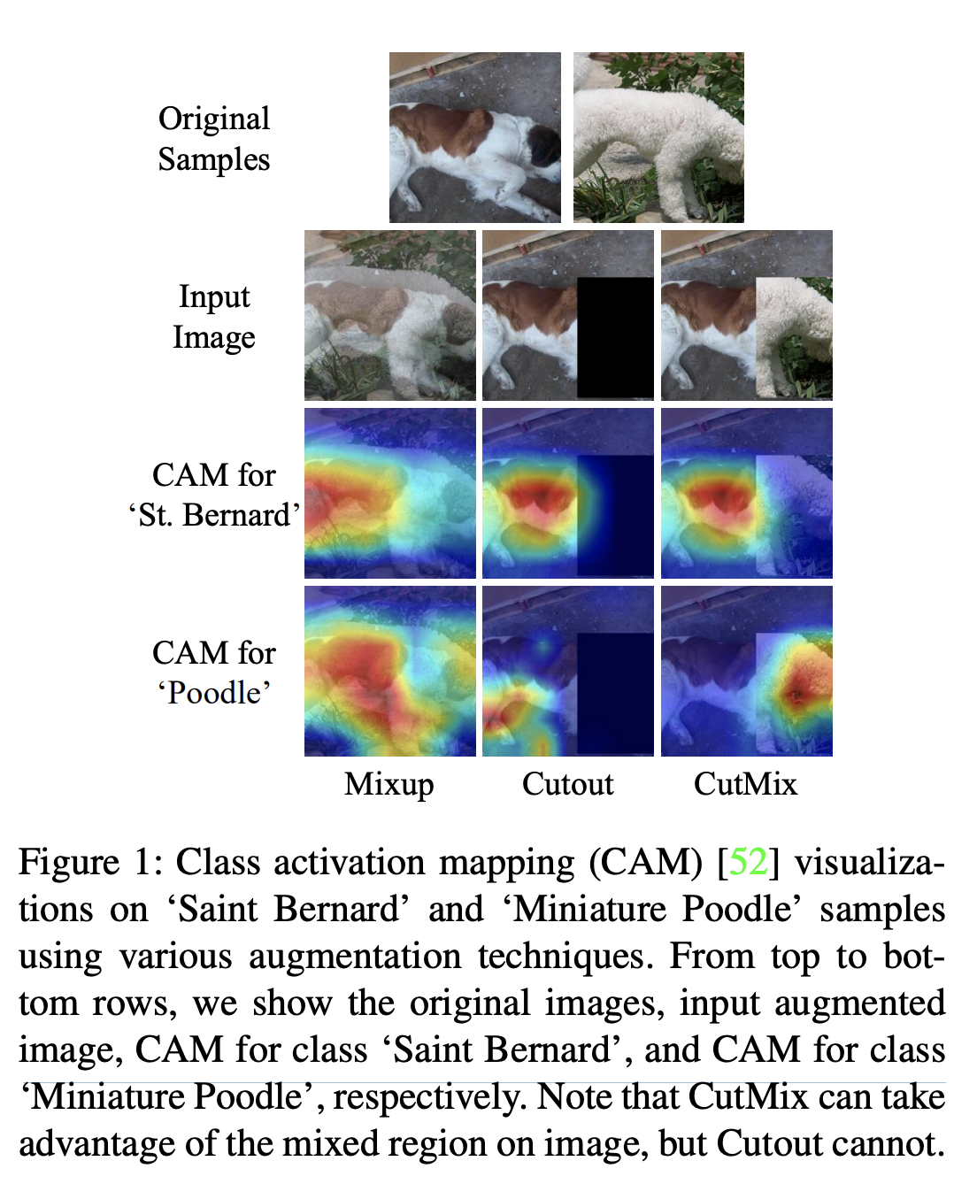 CutMix가 실제로 두 개의 객체를 각각의 부분적인 시야로부터 인식하도록 학습하는지 확인하기 위해 Cutout과 Mixup의 activation map을 시작적으로 비교한 것이 위의 Figure1이다