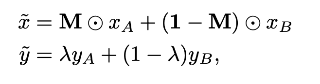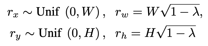 자른 영역의 크기 비율 \(\frac{r_w r_h}{W H} = 1 - \lambda )\ 로 결정된다. 자르기 영역을 기준으로 Bounding Box B 내부를 0으로 채우고, 그 외의 영역은 1로 채워 이진 \(M \in \mathbb{{0, 1}^{W \times H}}\)가 결정된다.