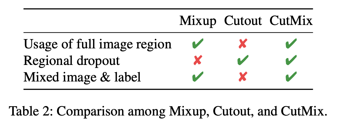 위의 테이블은 Mixup Cutout CutMix에 대한 주요 차이점을 요약한 것이다.