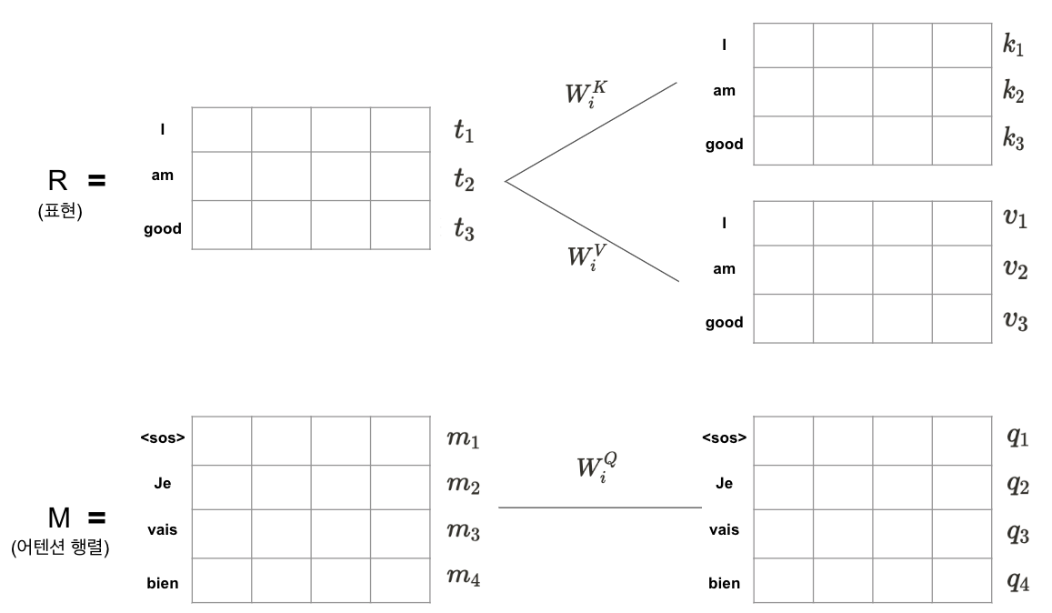 - 인코더 표현값 R에 가중치 행렬 \(W^K_i\), \(W^V_i\) 를 각각 곱해 키, 밸류 행렬 \(K_i\), \(V_i\)를 생성한다
