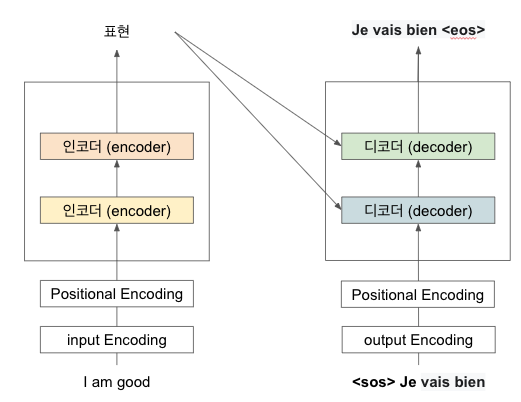 'I am good' 을 'Je vais bien'으로 번역한다고 가정해보자. 타킷 문장 시작 부분에 <sos> 토큰을 추가한 '<sos> Je vais bien' 을 디코더에 입력하면 디코더에서 'Je vais bien<eos>' 를 출력한다