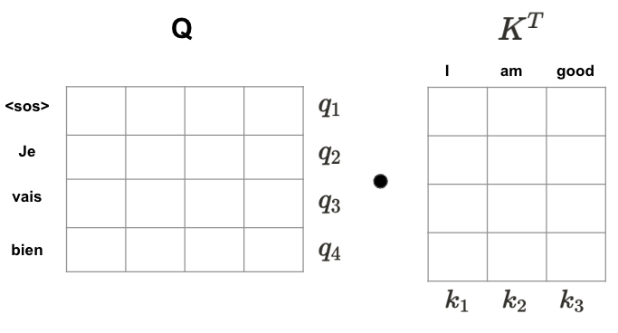 어텐션 행렬을 구한느 첫 번째 단계는 쿼리와 키 행렬 사이의 내적을 계산하는 것이다