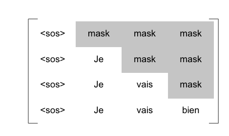 <sos> 다음 단어를 에측한다고 하자. 이와 같은 경우 모델은 <sos>까지만 볼 수 있어서 <sos> 오른쪽에 있는 모든 단어에 마스킹 작업을 한다. 그 다음으로 'Je' 단어를 예측한다고 하자. 이때 모델은 'Je'까지의 단어만 표시하므로 'Je' 오른쪽에 있는 모든 단어를 마스킹한다. 지금까지 설명한 내용은 아래의 그림에서 볼 수 있다