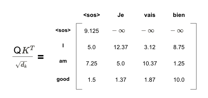 위 행렬에 소프트맥스 함수를 적용하기 전에 행렬 값에 대한 마스킹 처리가 필요하다. 예를 들어 위 행렬의 첫 번째 행을 보면 <sos>의 다음 단어를 에측한다고 할 때 모델에서는 <sos> 오늘쪽에 있는 모든 단어를 참조하지 말아야 한다 (텍스트 생성시 사용이 불가능하기 때문이다) <sos> 오른쪽에 있는 모든 단어를 -무한대로 마스킹을 수행한다