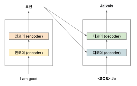 영어 (입력 문장) 'I am good'을 입력하면 프랑스어 (타킷 문장) 'je vais bien'을 생성하는 번역기를 만든다고 가정하자. 번역기를 만들려면 먼저 입력 문장인 'I am good'을 인코더에 입력해야 한다. 인코더는 임력 문장의 표현 학습한다.