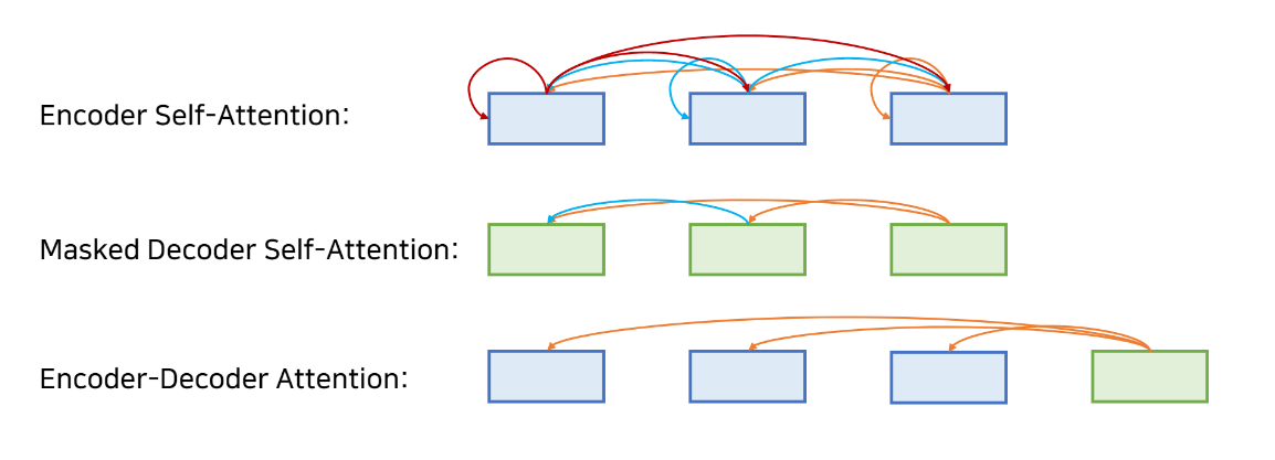 transformer에서 사용되고 있는 Encoder self-attetion, Masked decoder self-attention, Encoder-Decoder Attention 에 대한 시각화 자료